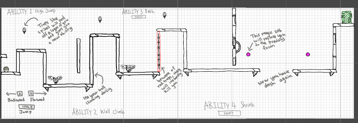 From the feedbacks I received, I thought about changing how the first level is laid out because one of the playtester completed the level using a method I didnt even know that could work. But I did not make any changes in the end because I thought it would be fine if there were multiple solutions. I did not pivot my idea yet, I think I'm sticking to my idea that a specific ability should be used in a specific part of the level and the players have to figure out when and what to use. However if they find another way that I don't think would be a shortcut I would not change the map.