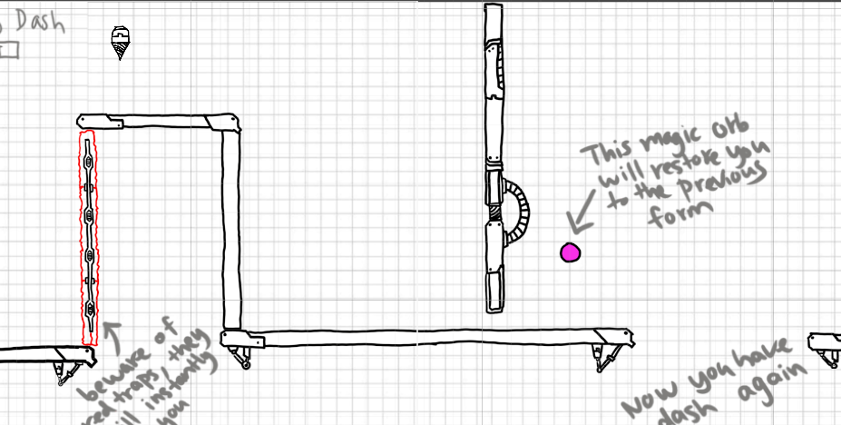 This picture also shows a bug where the player can be stuck in the tutorial level. The player can manage to get to here without changing their forms. There are two walls that are too high for them to get over and if they are here but doesnt have the wall climbing ability or the shrink ability, they will be stuck here. So I added a spike here so the player can actually change their form and not get stuck.